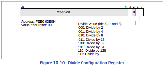 3": Local APIC는 주파수를 나누는 레지스터가 2개 존재한다(`Devide Configuration Register`와 `Count Register`). 엄밀하게 말하면, 카운트 레지스터는 `언제 타이머 인터럽트를 발생시킬 것인가`에 초점이 맞춰져 있다. 분배 설정 레지스터는 `주파수를 분배`에 초점이 되어 있다. 사실, 타이머에 분배 레지스터가 있는 것이 조금 의아하긴 하다. 대개 CLOCK 혹은 PLL 에서만 필요할 것 같은데, 이 레지스터가 왜 타이머에 있는지는 사실 잘 모르겠다.