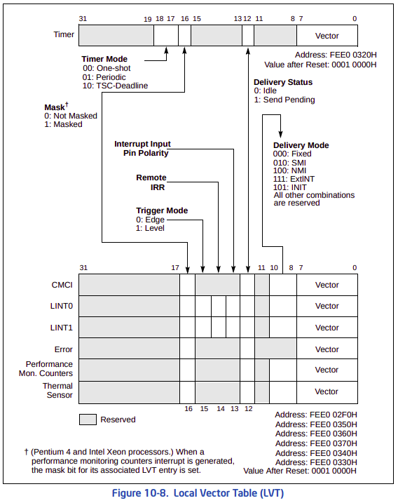 : LINT는 `Local Interrupt`의 약자로 Local APIC에 달려있는 2개의 핀을 의미한다. 이 글 맨 앞에서 이미 `LINT` 핀에 대해 언급하긴 했지만, 사실 이 핀은 잘 사용하지 않는 듯 하다. 특별한 기능을 위해서 나왔다기 보다는 호환성을 위해 달려있는 핀인거 같다. 위 `그림 10-8`과 함께 아래의 내용을 참고해서 LINT 관련 레지스터를 어떻게 설정하는지 보자. 이 핀들을 사용하지 않으려면, LINT[0|1] 레지스터에 각각 0x0001_0000을 쓰면 된다.