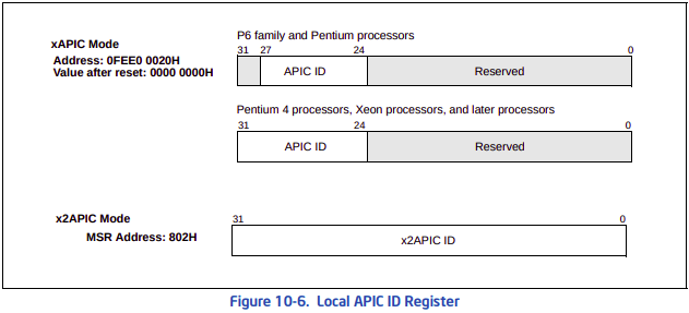: `LAPIC ID`는 멀티 프로세서 스케줄링시에 굉장히 중요한 개념이다. 왜냐면, 이 값을 기준으로 각 프로세서를 구분하기 때문이다(각 LAPIC와 CPU 코어는 1:1 대응된다). `xAPIC 모드`에서는 MSB 8비트만 읽으면 된다. 팬티엄 6 시리즈건 제온 이건 상관없이, `xAPIC Mode`에서는 MSB 8비트면 LAPIC를 구분할 수 있다.