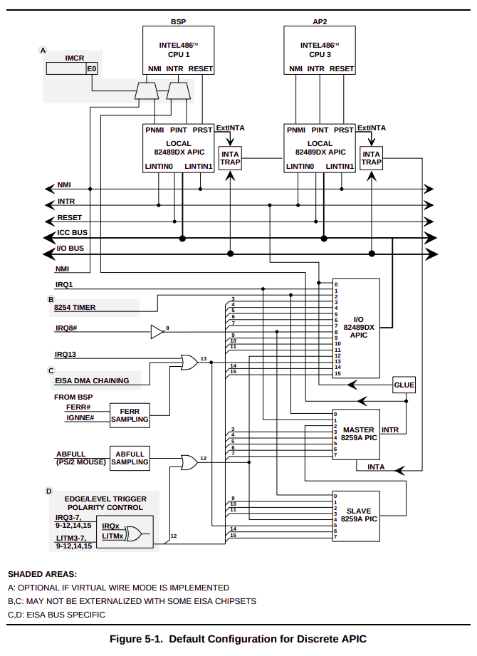2" 486 및 초기 펜티엄 프로세서에는 Local APIC가 프로세서 온 칩이 아니었다. 그래서 프로세서 자체에 `NMI`와 `INTR`핀이 Local APIC와는 별도로 존재했다. 그래서 8259A로부터 외부 인터럽트를 다이렉트로 받는 구조였다.: 아래는 `486` 및 펜티엄 초기 버전의 APIC의 구조를 보여준다. 프로세서에 별도로 `NMI`와 `INTR`이 존재하는 것을 확인할 수 있다. `2` 번에서 말하고자 하는 내용은 Local APIC가 활성화 되어있어도 486 및 초기 펜티엄은 `LINT[1:0]`을 사용할 수 없다는 뜻이다.