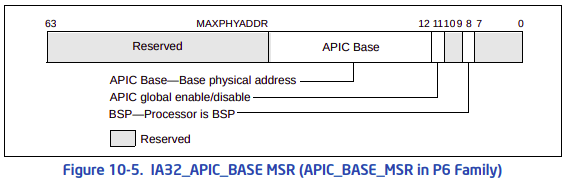 • Bits 0 through 7, bits 9 and 10, and bits MAXPHYADDR1 through 63 in the IA32_APIC_BASE MSR are reserved.