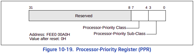 • PPR[7:4] (the processor-priority class) the maximum of TPR[7:4] (the task- priority class) and ISRV[7:4] (the priority of the highest priority interrupt in service).