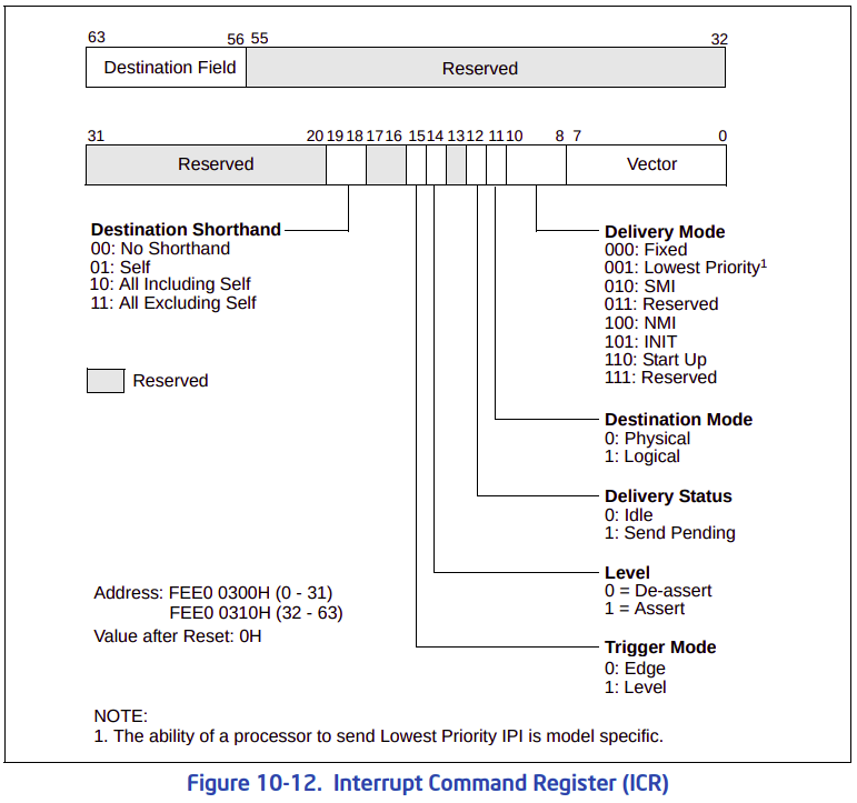 - 참고 : 10.6.1 Interrupt Command Register (ICR): 위의 내용을 요약하면 다음과 같다.