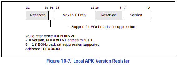 : 근데 이 기능을 무조건 쓸 수 있는 건 아니다. `Local APIC Version Register`의 24번 비트가 SET이면, `EOI Broadcast Suppression`를 지원한다는 뜻이다.