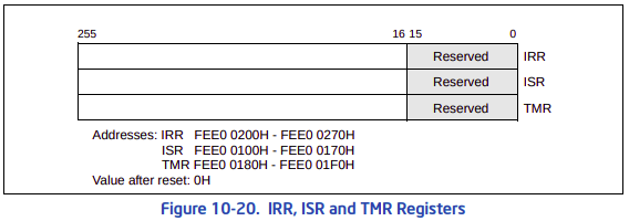 The local APIC queues the fixed interrupts that it accepts in one of two interrupt pending registers: the interrupt request register (IRR) or in-service register (ISR). These `two 256-bit read-only registers` are shown in Figure 10-20. The 256 bits in these registers represent the 256 possible vectors; vectors 0 through 15 are reserved by the APIC (see also: Section 10.5.2, “Valid Interrupt Vectors”).