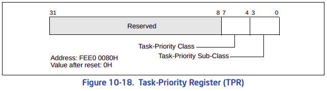 The local APIC also defines a task priority and a processor priority that determine `the order` in which interrupts are handled. The task-priority class is the value of bits 7:4 of the task-priority register (TPR), which can be written by software (TPR is a read/write register); see Figure 10-18.