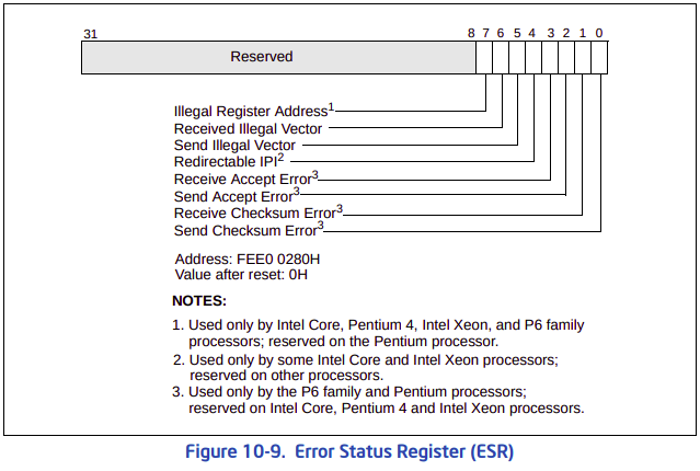 The local APIC records `errors detected during interrupt handling` in the error status register (ESR). The format of the ESR is given in Figure 10-9; it contains the following flags: