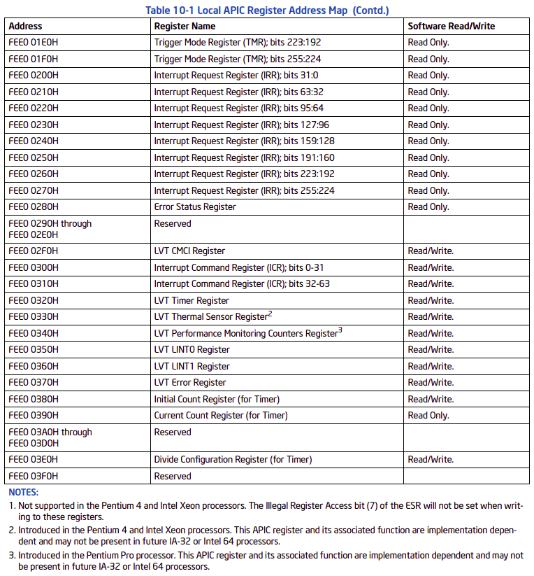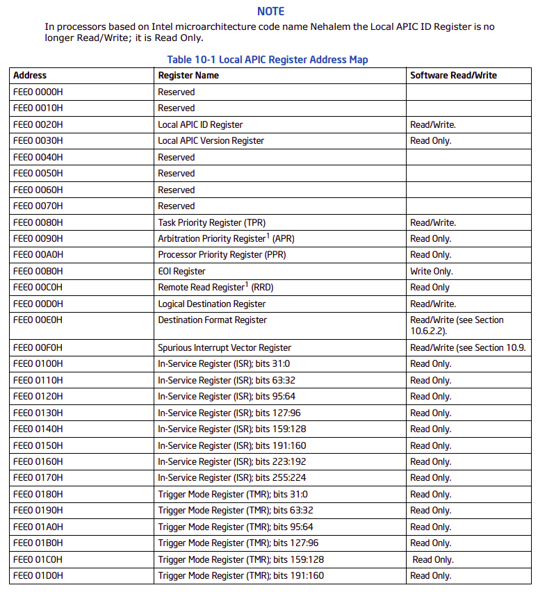 1" Local APIC의 메모리 맵 시작 주소는 프로세서의 물리 주소는 FEE00000h에 위치한다. 크기는 4KB를 차지한다. 정확히 4KB를 차지하므로, 코딩할 때, 패딩 및 정렬에 주의하자.