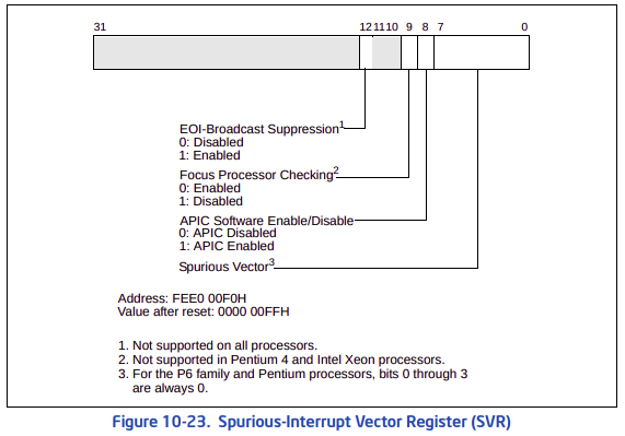 2. Using the APIC software enable/disable flag in the `spurious-interrupt vector register` (see Figure 10-23):