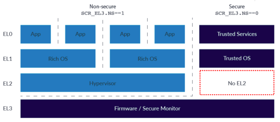 " ARMv7-A 에서 virtualization 이 처음 소개되었을 때, non-secure state 쪽에서만 사용되던 개념이었다. 이전 섹션들에서 설명했다시피, EL3 는 `host firmware` 와 `Secure Monitor` 가 사용하는 영역이다. 그리고, Seure EL0/1 은 TEE 를 host 한다. 즉, Secure EL0 은 Trusted services, Secure EL1 은 Trsuted kernel 과 mapping 된다.