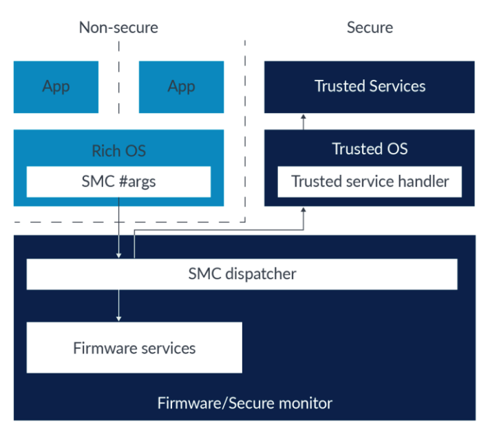 " SMC 명령어는 EL3 의 SMC dispatcher 에 의해서 누가 SMC 명령어를 처리할지 결정된다. 만약, EL1 에서 firmware services 을 요청했다면, EL3 에 있는 Firmware 에서 처리한다. 그러나, SMC 명령어가 TEE service 를 요청한 것이라면, Trusted OS 로 전달한다.