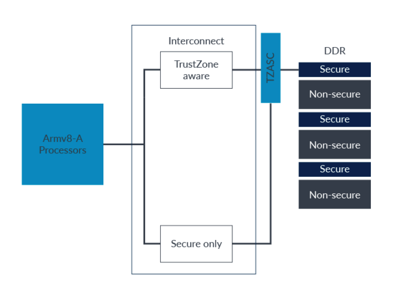 " 모든 devices 들에게 일관성 있게 secure region & non-secure region 을 모두 제공하기 위해서는 device 보다는 memory 에 초점을 맞춰야 한다. 예를 들어, off-chip DDR 같은 경우는 사이즈가 굉장히 크다. 이 메모리를 device 별로 split 하여 해당 영역을 다시 secure & non-secure 로 partitioning 하면, 디바이스 별로 secure 와 non-secure regions 을 가질 수 있게 된다. 그런데, off-chip DDR 을 어떻게 secure & non-secue regions 으로 나눌 수 있을까? 이 때, 사용하는 것이 바로 `TrustZone Address Space Controller(TZASC)` 다.
