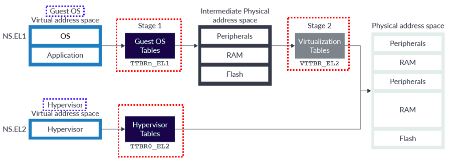 " 아래 block diagram 은 multiple virtual address spaces 을 보여준다. 예를 들어, Guest OS 가 존재하는 EL1 에서 실제 physical address space 에 access 하기 위해서는 2 번의 translation regimes 을 거쳐야 한다. 먼저, EL0/1 용 translation regime 에 하나 거친 뒤, EL2 용 translation regime 을 거쳐야 실제 physical address space 에 access 할 수 있다.