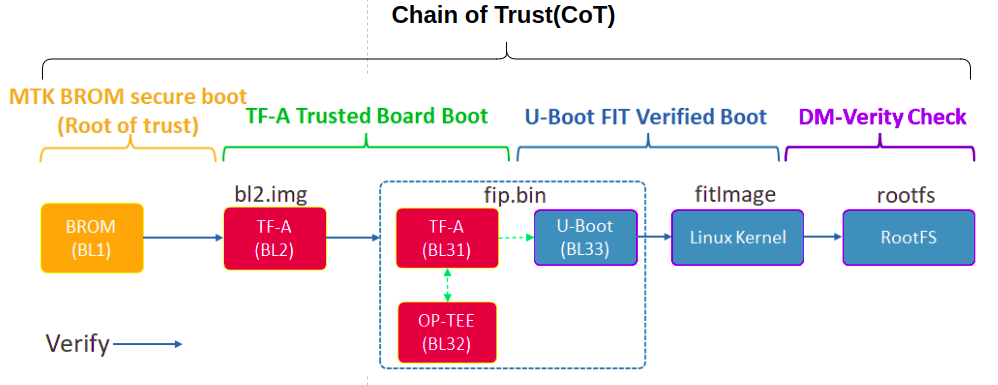 " 아래 그림은 미디어텍의 secure boot flow 를 보여준다. TF-A(BL31) 가 TEE(OP-TEE, secure) 와 U-boot(위에서 UEFI, non-secure) 를 loading 하는 것을 볼 수 있다. 여기서 TEE 가 갖춰지면서 secure world 가 생성된다고 보면 된다(이 secure world 란 결국 secure-resources or secure-services 들에 access 하기 위해서는 secure firmware 를 통해서만 가능하다는 것을 의미한다).