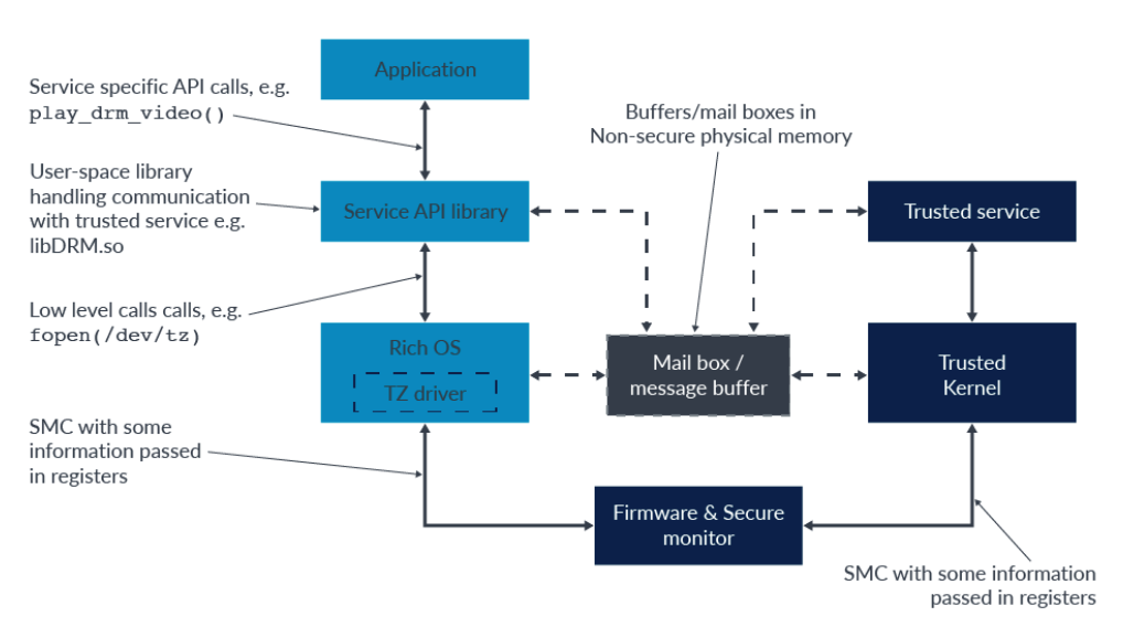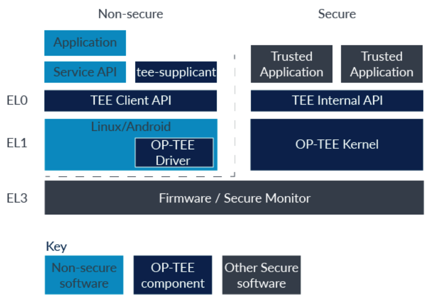 " non-secure kernel space 에는 low-level OP-TEE driver 가 존재한다. 이 드라이버를 통해서 non-secure software 가 OP-TEE kernel 과 communication 을 할 수 있다(OP-TEE kernel 과 직접 통신을 하는것은 아니다. OP-TEE driver 가 EL3 firmware 를 호출하는 명령어를 warpping 하고 있기 때문에 마치 OP-TEE driver 가 OP-TEE kernel 과 직접 통신하는 것처럼 보일 뿐이다).