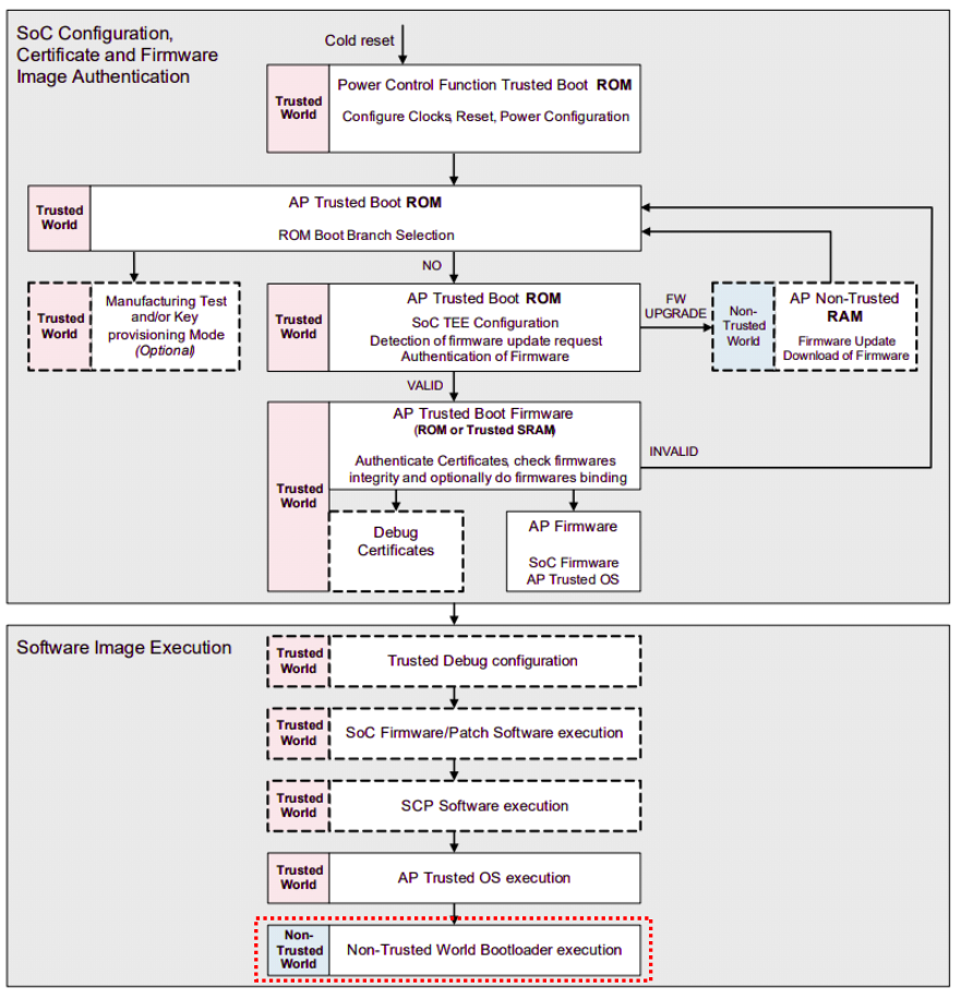 " 참고로, TBBR 은 secure on-chip firmware 의 boot process 과정만을 제시하는 스펙이다. 즉, `operating system` or `boot loader to load operating system` 가 실행되기 전까지만 설명한다. 아래 그림을 보면, `Trusted World` 의 boot process 만 설명하는 것을 볼 수 있다. `Non-Trusted World` 의 boot process 는 책임지지 않는다. 이 부분은 Non-Trusted World 영역은 `UEFI - Secure Boot` 스펙과 함께 봐야한다.