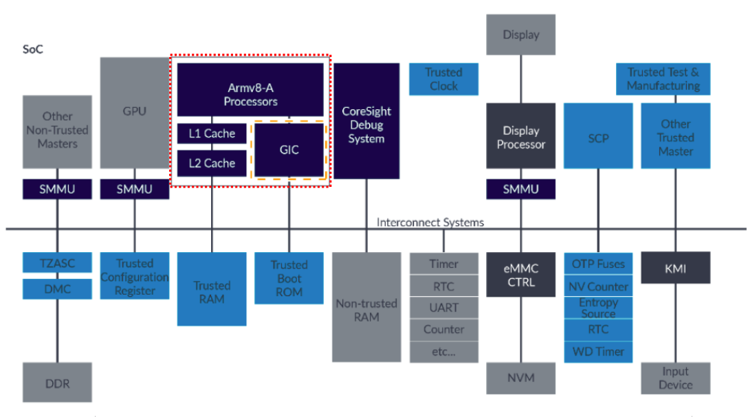 " ARMv8-A Processors(Secure aware) 들이 SCP(Secure) 와 데이터를 주고 받기 위해서 어떻게 해야 할까? 혹은 ARMv8-A Processors(Secure aware) 들이 Timer(Non-secure) 와 데이터를 주고 받기 위해서는 어떻게 해야 할까? 아래 그림은 기준으로 보면, CPU`s 들과 devices 들은 `Interconnect Systems` 이라는 것을 통해 연결되어 있다. interconnect systems 는 쉽게 bus 라고 보면 될 것 같다. 그리고, 이 bus 는 arm architecture 기반으로 동작하므로, AMBA 임을 알 수 있다. 결국, AMBA 프로토콜에 맞게 데이터를 전송하면 데이터 통신을 할 수 있다. 그런데, hardware level 에서 TrustZone 이 지원되면서 bus 에 단순히 데이터만 보내는 시대는 끝이났다. 즉, AMBA 에 TrustZone 관련 pin 들이 추가되었음을 의미한다. 가장 대표적으로 AMBA APB 에 `PPROT` 핀이 추가되었다.