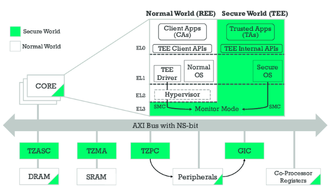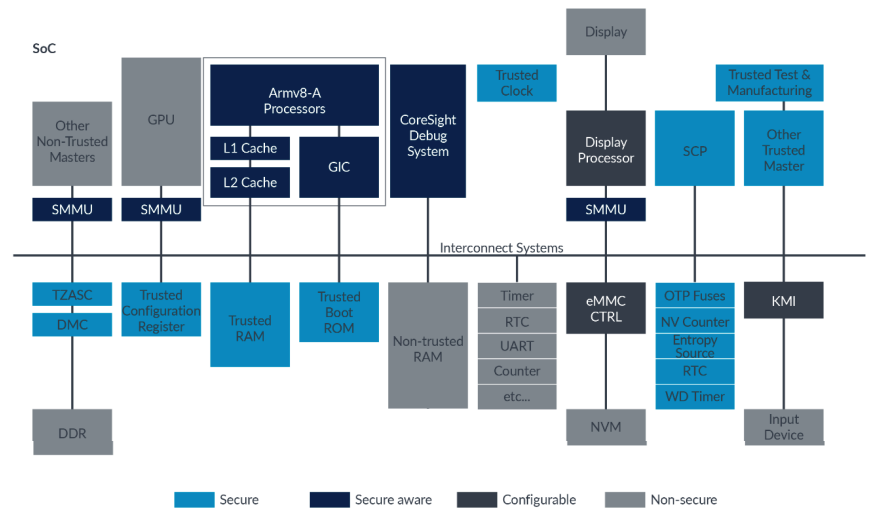 1. TrsutZone aware : ARM processor or SMMU 같은 경우는 TrustZone 을 인지할 수 있도록 설계되어 있다. 즉, 이와 같은 TrustZone aware devices 들은 bus 에 데이터를 전송할 때, 적절한 security information 을 함께 전달한다.