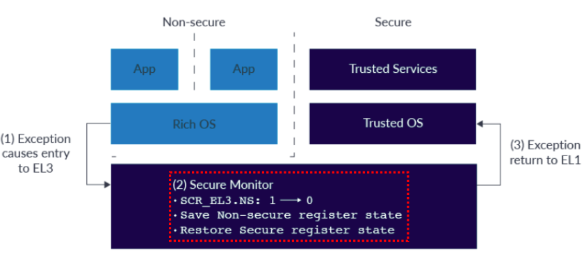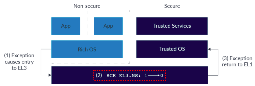 3. exception 이 return 되면, EL3 에서 S.EL1 으로 제어권이 넘어간다. 참고로, 위에 block diagram 에서는 EL2 가 생략되어 있다.