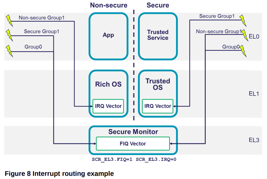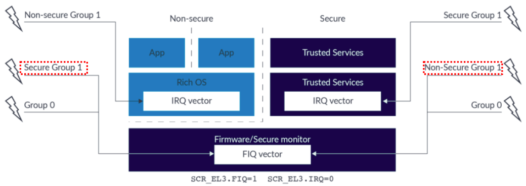 1. Group 0 interrupt 는 무조건 FIQ exception 을 발생시킨다. 즉, EL3 로 진입하게 된다. 위에서 얘기했지만, FIQ 는 low-level system control service 가 필요한 경우다.