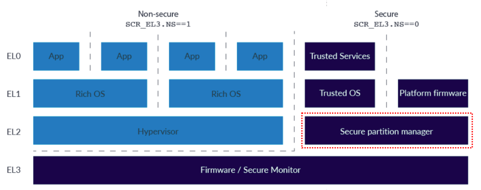 " 위 문제들의 해결책으로 ARMv8.4 에서 Secure state 에 EL2 를 추가했다. S.EL2 는 NS.EL2 와 같은 full hypervisor 보다는 Secure Partition Manager(SPM) 를 host 한다. 시스템은 SPM 을 통해서 여러 개의 partitions 들을 가질 수 있다. 그리고, 각 parittion 마다 개별적인 Trusted kernels 과 Trusted services 들이 동작할 수 있다.