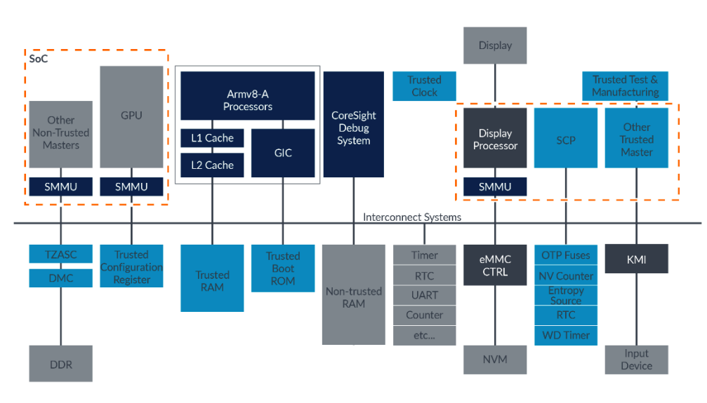 " Trusted Firmware 는 interconnect 와 같은 ARM systme IP`s 들을 컨트롤할 수 있는 인터페이스를 제공한다. SoC 제조사에서는 SoC Specific Firmware 를 컨트롤할 수 있도록 ARM 에서 제공하는 PSCI, SMCCC 등의 인터페이스를 구현해야 한다.
