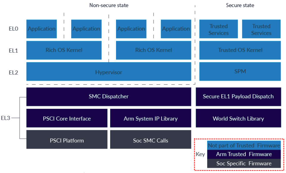 2. 최소한의 권한으로 실행한다는 원칙에 따라(즉, 낮은 권한에서 실행할 수 있는 기능들은 낮은 권한에서 실행되야 한다), EL3 firmware 기능의 일부를 EL3 에서 빼낼 필요성을 느낌.