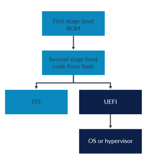 " boot 는 TrustZone-enabled system 에서는 굉장히 중요한 파트다. 쉽게, verified 된 software 를 통해서만 new software 가 loading 될 수 있다는 것이다. 아래 그림을 예시로 들자면, Second stage boot code 가 verified 되었다면, TEE 와 UEFI 를 loading 할 수 있다는 것이다. 대개, 신뢰성을 검증할 때는 image 를 hashing 해서 signature 를 image header 에 저장한다. 그리고, current verified loader 가 next load image 이 signature 를 검사해서 load 할지를 결정한다. 이러한 과정을 `Chain Of Trust` 라고도 부른다. 이 섹션은 secure boot 가 아닌 TBBR 을 기준으로 boot flow 를 설명한다(Secure boot 도 specification 이 있긴하지만, 제조사마다 방식이 서로 다른 것 같아 좀 더 확인이 필요하다. 일단, secure boot 의 원조는 UEFI 이기 때문에 secure boot flow 를 정확히 알고 싶다면, UEFI specification 을 참고하도록 하자).
