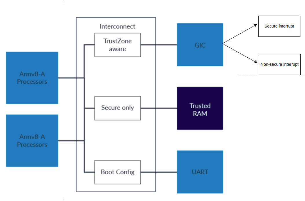 4. TrustZone aware : slave deivce 에 이 상태가 설정되면, interconnect 는 모든 access 를 허용한다. interconnect 에 연결된 slave device 는 각자 자신만의 isolation mechanism 을 구현해야 한다. 아래의 block diagram 을 보자.