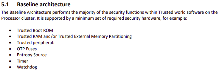 3. Non-secure state firmware(UEFI or U-boot 등) or Rich OS image - `5.3 Boot and the chain of trust` 섹션에서 그림에서 해당 components 들은 `남색` 으로 표시되어 있다. 즉, secure-aware 로 표시된 영역이다. 반드시 secure 할 필요는 없다는 것이다. 그리고, 이름에서 알 수 있다시피, non-secure state software 는 낮은 보안 레벨에 있는 software 를 의미한다. 즉, booting 을 허용할 수는 있지만, TEE 에서 제공하는 advanced functions 들을 사용할 수는 없다. 예를 들어, TrustZone-enabled DRM 은 untrusted OS image 에서는 사용할 수 없다.