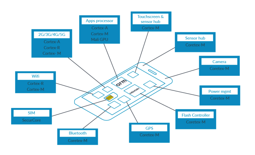 " 현재 대부분의 mobile SoC 는 A-profile, R-profile, M-profile 들이 혼합되어 있는 구조다. 예를 들어, mobile 에서 A-profile 은 mobile OS(Android) 를 실행하고, R-profile 은 cellular modem, M-profile 은 low-level system control(SCP) 을 맡고있다. 아래 diagram 은 mobile device 에 들어있는 다양한 프로세서들을 보여준다.