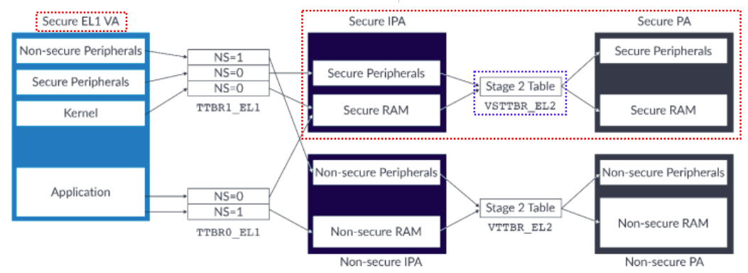 " 또한, secure state 와 non-secure state 는 별도의 translation regimes 을 갖고 있다. 아래 block diagram 을 보자. S.EL2 가 enabled 상태에서 non-secure state 와 secure state 의 translation regimes 의 차이는 stage 2 에서 나타낸다. 그리고, Stage 1 tables 들과는 다르게, Stage 2 table 에는 NS bit 가 없다. IPA(Inter-mediate Physical Address) 를 보면, NS=0:VA 는 결국 Non-secure physical address 로 translation 되고, NS=1:VA 는 Secure physical address 로 translation 되는 것을 보여준다. 그렇다면, IPA 에서 PA 로의 translation 은 어떻게 되는 것일까? 여기서 VTTBR_EL2 레지스터가 사용된다. non-secure 는 VTTBR_EL2 를 사용하고, secue 는 VSTTBR_EL2 를 사용한다.