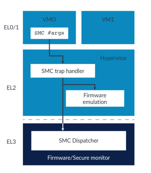 " hypervisor 는 EL1 에서 전달된 SMC 명령어를 확인해서 EL1 에서 요청하는게 firmware service(예를 들어, power management) 인지 혹은 Trusted service 인지를 판단한다. 만약, 요청이 firmware service 라면, hypervisor 는 guest virtual machine 에 맞춰서 가상으로 구현된 firmware 를 호출한다. 만약, 요청이 trusted service request 라면, EL3 로 넘길 수 있다.