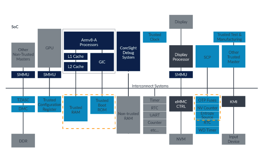 " 위에 내용만으로도 on-chip ROM 은 굉장히 강력한 secure device 라는 것을 알 수 있다. Trusted RAM 은 흔히 `internal SRAM` 이라고 부른다. 이것도 `on-chip` 이기 때문에, 외부에서 access 하는 것 자체가 어렵다.