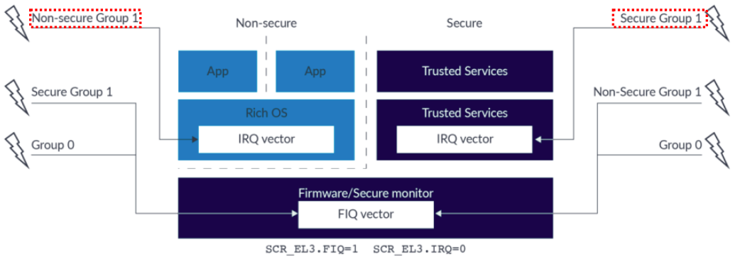 1.현재 processor 의 secure state 가 secure state 라면, non-secure group 1 interrupts 들은 FIQ exception 으로 forwarding 한다. 2.현재 processor 의 secure state 가 non-secure state 라면, non-secure group 1 interrupts 들은 IRQ exception 으로 forwarding 한다.