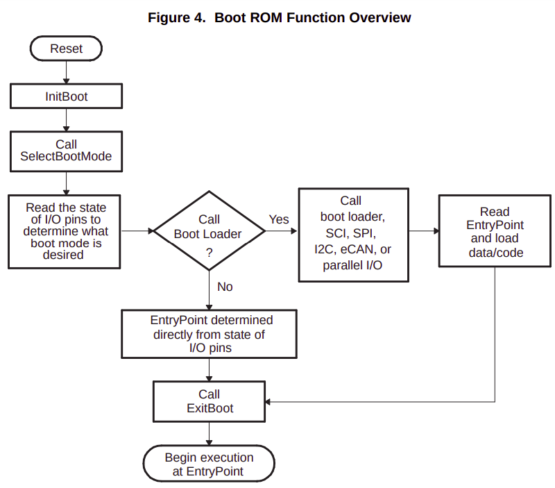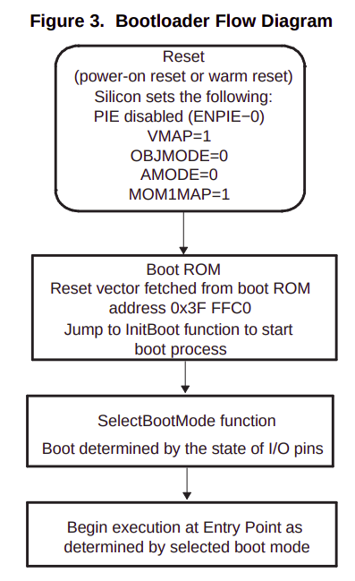 " internal boot ROM memory 에서 핸들링되는 유일한 vector 는 0x3F_FFC0 에 저장되어 있는 `reset vector` 다. 즉, boot ROM 에게 할당받은 0x3F_F000 - 0x3F_FFFF 내에서 유일하게 처리가 가능한 vector 가 reset vector 라는 뜻이다. 왜, 그럴까? 이건 reset vector 가 공장에서 양산될 때, boot ROM 에 저장되어 있는 `initBoot function` 을 가리키도록 설계되어 있기 때문이다. 즉, TMS320x280x, 2801x, 2804x 칩들은 전원을 인가하면 하드웨어적으로 initBoot 함수를 호출한다는 것이다. 여기서 기본적인 devie initialization 을 수행한 후, GPIO pins 검사해서 어떤 boot mode 를 사용할지를 결정하게 된다.