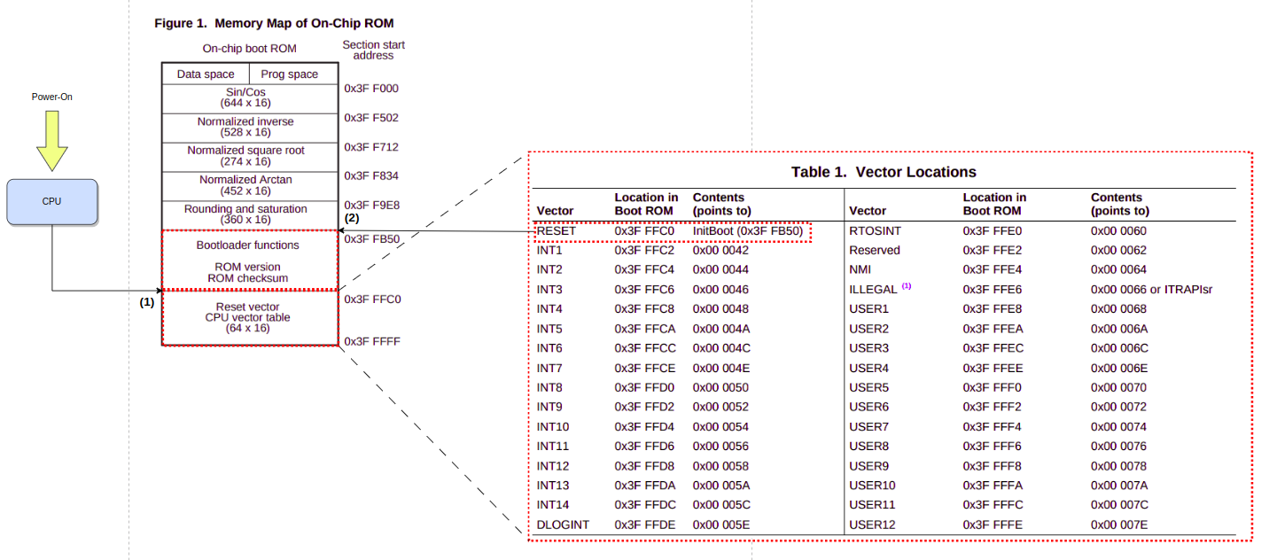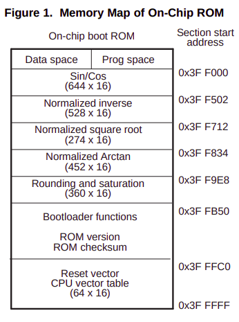 " Boot ROM 코드는 공장에서 생상되는 시점에 CPU 의 특정 physical address space 로 mapping 된다. 예를 들어, TMS320x280x, 2801x, 2804x 칩들은 0x3F_F000 - 0x3F_FFFF 로 mapping 된다. 사이즈는 4KB 로 차지한다. 이 4KB 는 다시 16B 로 나누어 총 256 개의 blocks 들로 나누어져 있다.