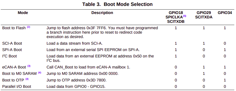 " boot ROM code 는 3개의 GPIO 를 검사해서 어떤 boot mode 를 사용하는지 검사한다. 아래에서 볼 수 있다시피, TMS320x280x, 2801x, 2804x 칩은 총 8개의 boot mode 를 지원한다.