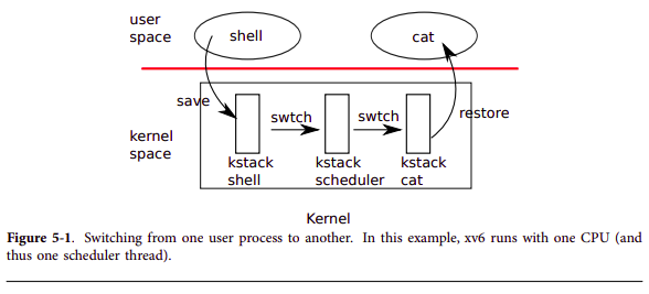 0" 페이지 테이블 교체 : 컨택스트 스위칭이 발생하는 시점에 동작하고 있는 프로세스는 `스케줄러`다. `xv6` 문서에서는 `컨택스트 스위칭` 절차에 대해 아래와 같이 설명하고 있다. 아래 문서에서도 볼 수 있다시피, `컨택스트 스위칭`이 일어나려면, 반드시 스케줄러가 먼저 동작하고 있어야 한다. 그런데, 스케줄러는 커널 영역에 대한 가상 주소만 할당받은 페이지 테이블을 사용하고 있다(`kpgdir`). `xv6`의 프로세스들은 자신만의 별도의 페이지 테이블을 가지고 있다(유저 레벨과 커널 레벨이 하나의 페이지 테이블에 함께 관리된다). 사실, 프로세스 보다도 페이지 테이블을 변경함으로써, 완전히 새로운 프로그램이 될 수 있다. 예를 들어, `exec` 프로그램에 대한 바이너리 정보를 갖고 있는 페이지 테이블 A가 있고, `fork` 프로그램에 대한 바이너리 정보를 갖고 있는 페이지 테이블 B가 있다고 치자. 이 때, 프로세스가 페이지 테이블 A를 사용하면 `exec`와 같은 프로그램이 되는 것이고, 페이지 테이블 B를 사용하면, `fork`와 같은 프로그램이 되는 것이다.